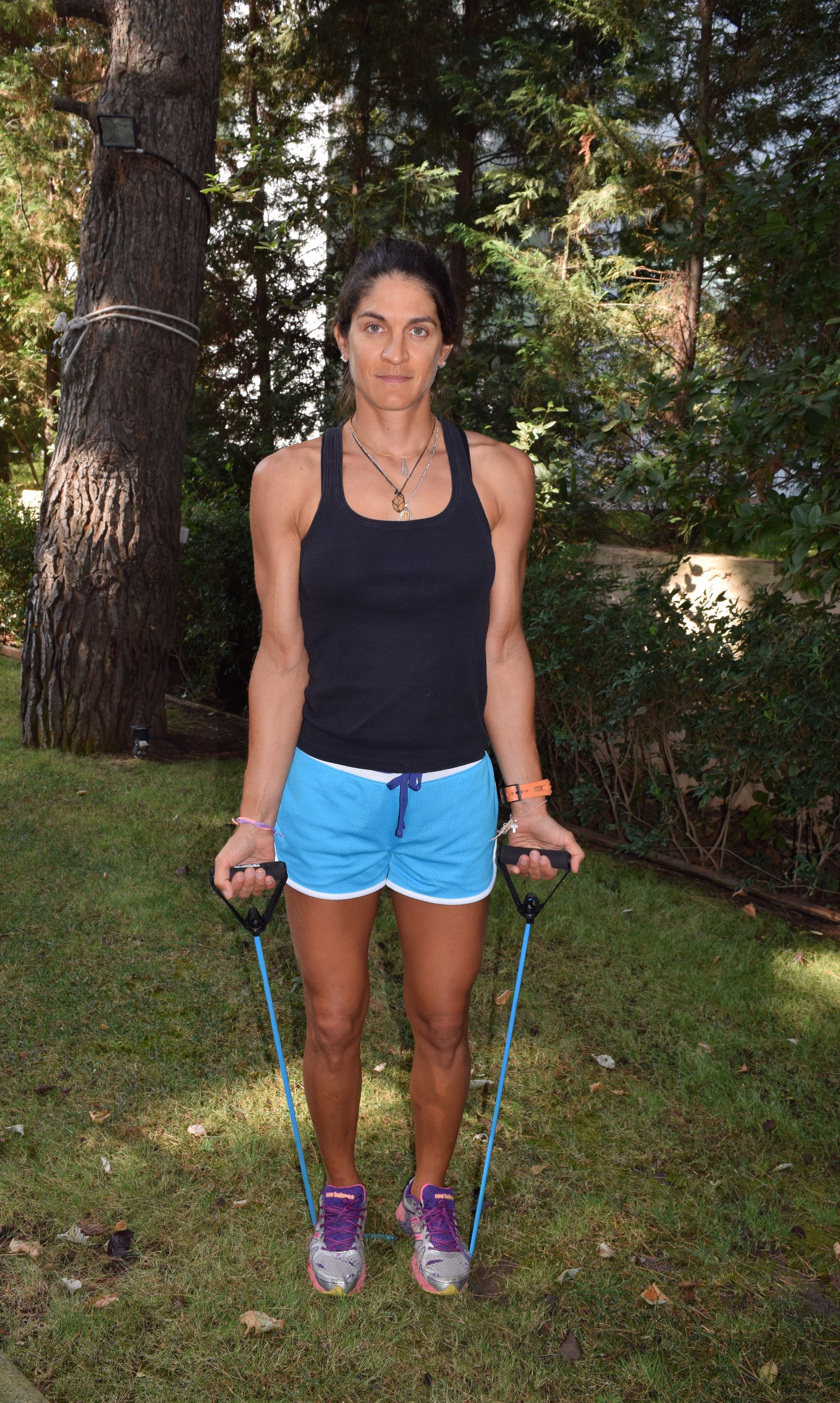 Place the resistance band under your feet and stand up straight with your legs shoulder width apart. Hold the handles and lower down into a squat position, keeping the elastic band at a 90 degree angle with your arms and your chest up. Exhale as you come back up and repeat.