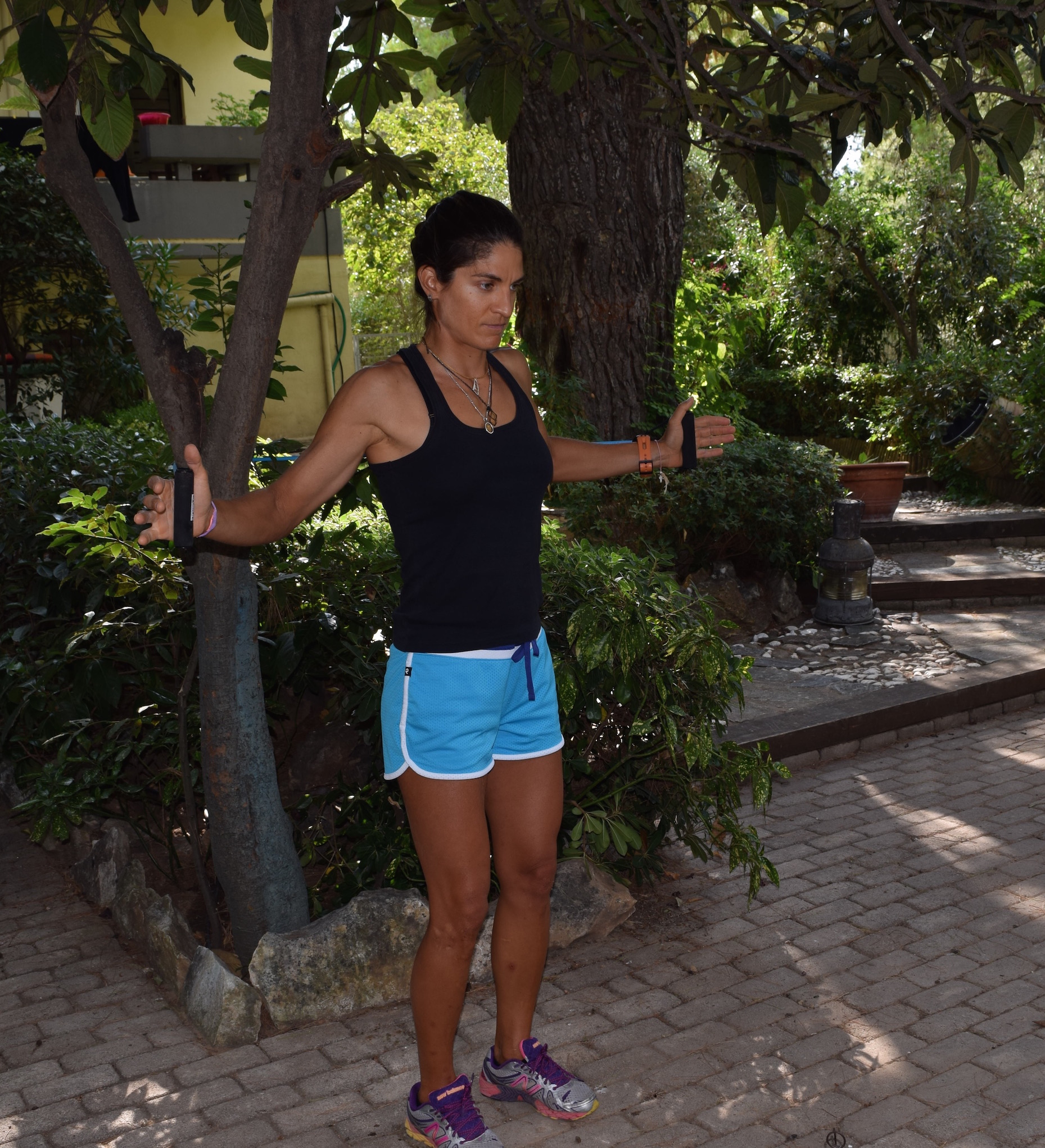 Place the resistance band around a tree or a pole and stand upright facing away from it. Walk forward away from the anchor point to create resistance. Start with holding your arms apart at shoulder height and keep your feet soft in a split stance. Exhale and push your arms close together. Inhale as you bring them back to the starting position. Repeat.