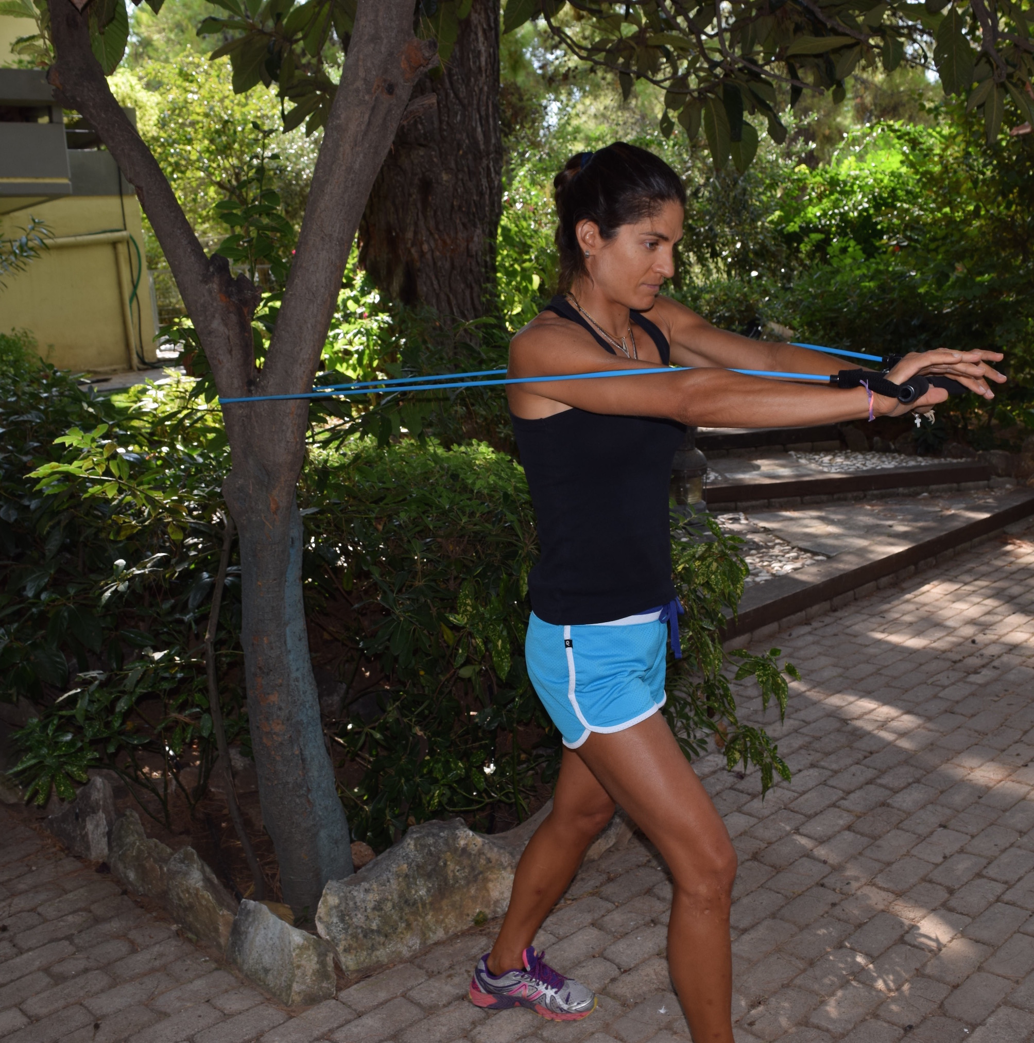 Place the resistance band around a tree or a pole and stand upright facing away from it. Walk forward away from the anchor point to create resistance. Start with holding your arms at 90 degrees and keep your feet soft in a split stance. Exhale and push your arms close together. Inhale as you bring them back to the starting position. Repeat.