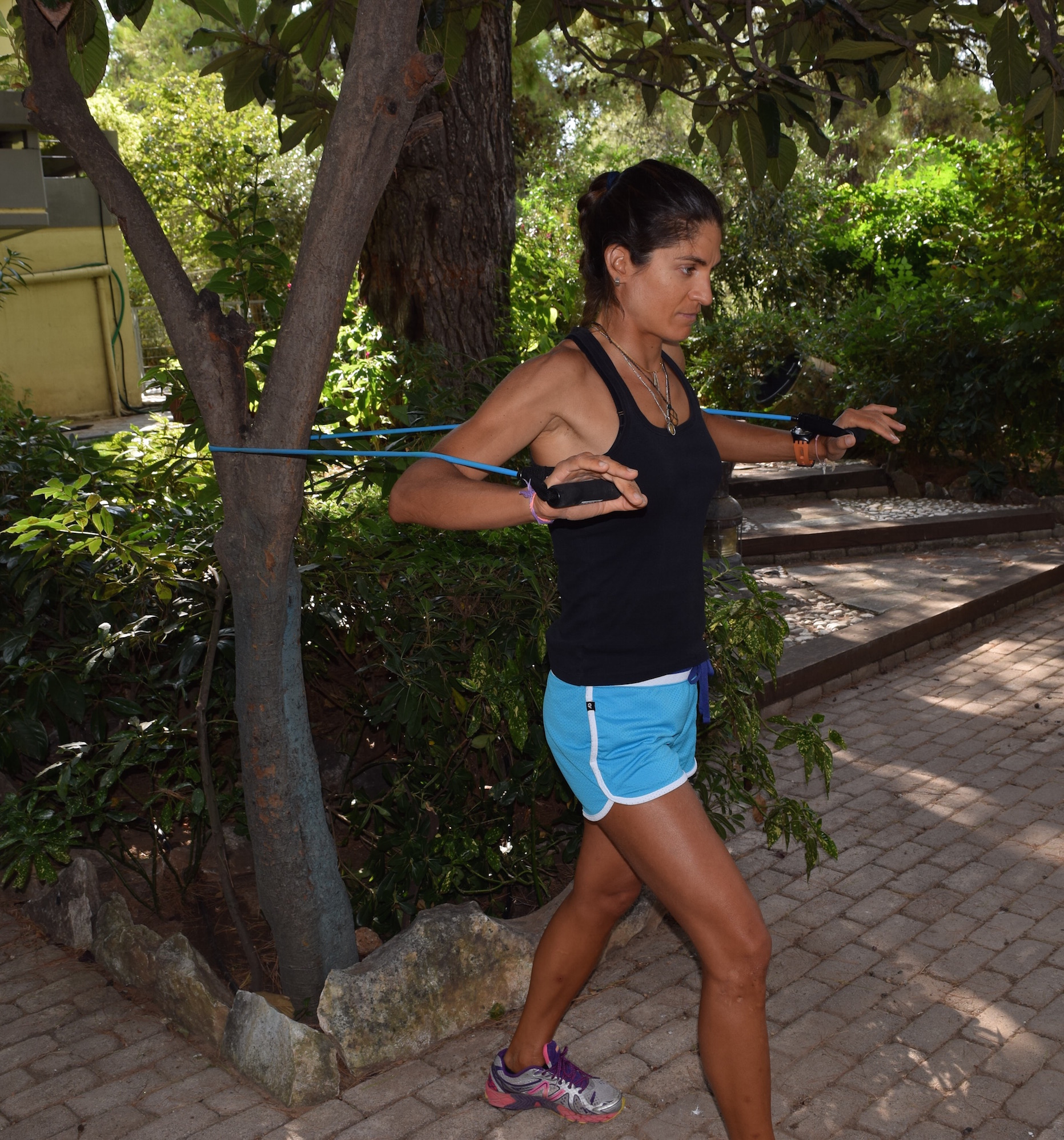 Place the resistance band around a tree or a pole and stand upright facing it. Walk backwards away from the anchor point to create resistance. Start with holding your arms out straight. Keep your knees soft and exhale as you pull the handles back, keeping your elbows close to your torso and your torso upright. Inhale and return to the starting position. Repeat.