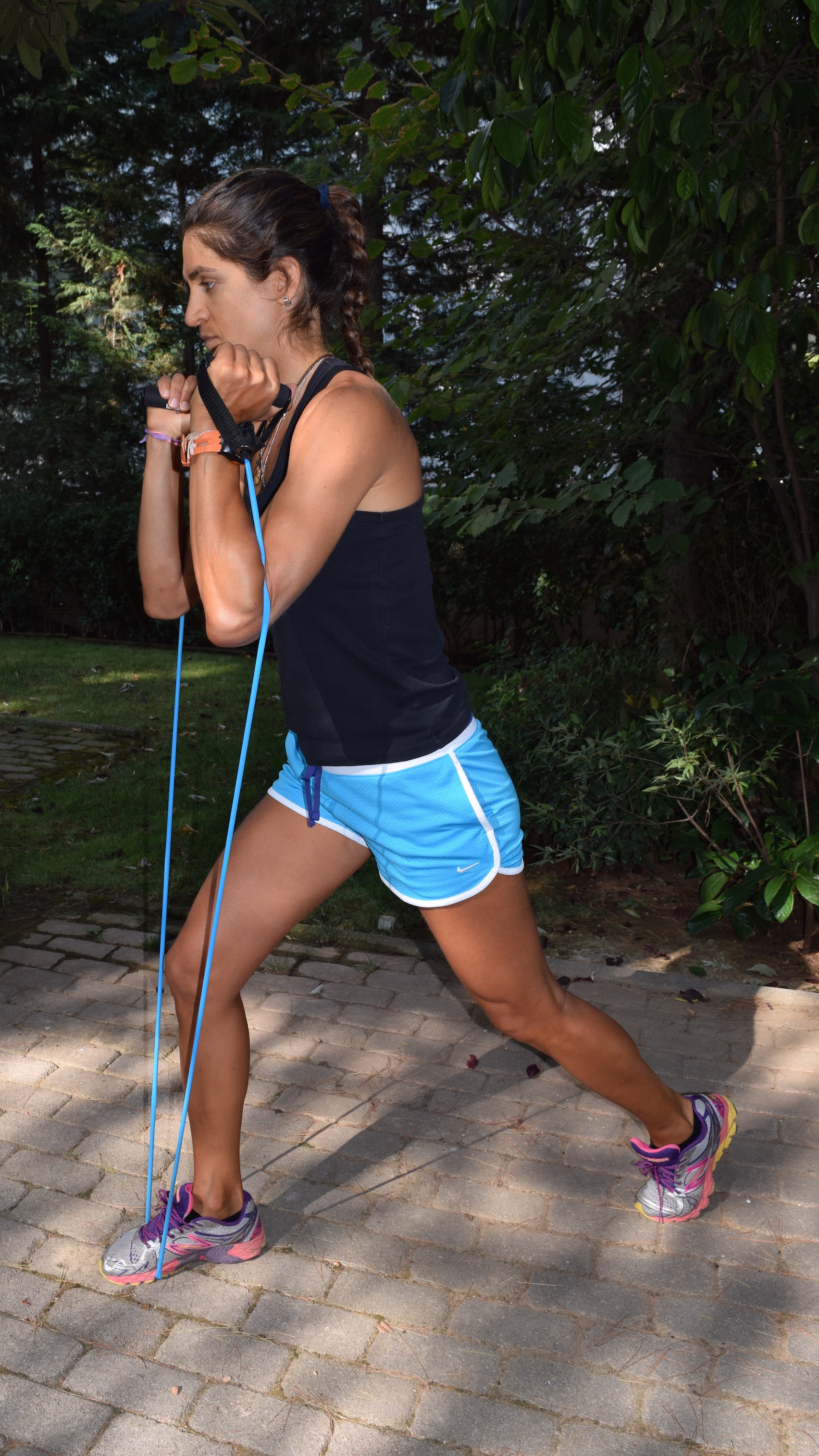 Start in a split stance with the resistance band under your front leg and hold your torso upright. This is your starting position. Lower down keeping your chest up. Don’t let your front knee go forward beyond your toes and keep both knees in line with your toes. Use the heel of your front foot to push up and back to the starting position as you exhale. Repeat for the specified amount of repetitions on the same leg before you switch leg.
