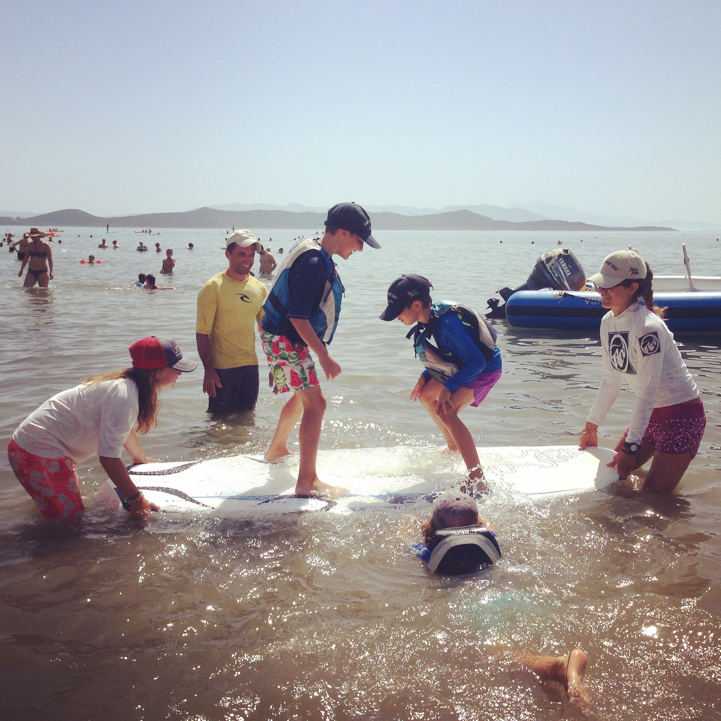 When I have a child signing up for their first windsurfing lesson, I first coach them one-to-one, so I can give them time to learn the parts of the equipment and how the sail works. I then include them in a group with 1 or 2 more children – this not only makes the whole experience more fun, but the kids can work together as a team and learn from each other!